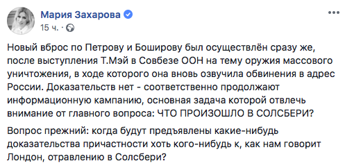 "Новый вброс по Петрову и Боширову был осуществлен сразу же, после выступления Т.Мэй в Совбезе ООН на тему оружия массового уничтожения, в ходе которого она вновь озвучила обвинения в адрес России. Доказательств нет - соответственно продолжают информационную кампанию, основная задача которой отвлечь внимание от главного вопроса: ЧТО ПРОИЗОШЛО В СОЛСБЕРИ? Вопрос прежний: когда будут предъявлены какие-нибудь доказательства причастности хоть кого-нибудь к, как нам говорит Лондон, отравлению в Солсбери?".
