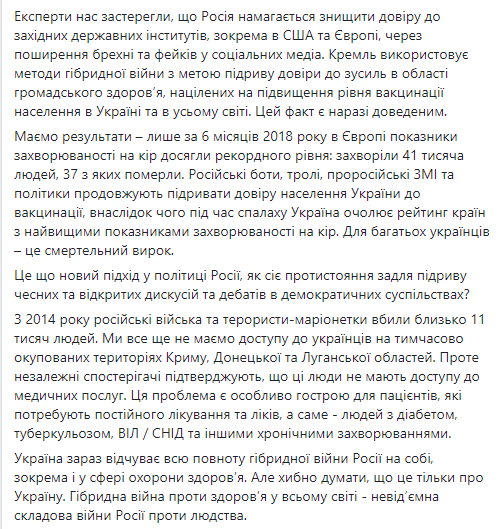 "Украина сейчас чувствует всю полноту гибридной войны России на себе, в том числе и в сфере здравоохранения", - резюмировала она.