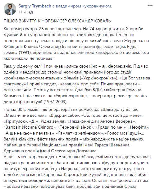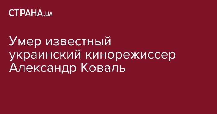 Украинский кинорежиссер Александр Коваль умер на 74-м году жизни. Об этом сообщил кинокритик Сергей Трымбач.