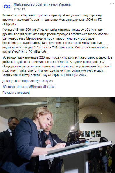 "Сегодня по меньшей мере 223 тысяч человек общается жестовой речью. Это делает ее одной из наиболее применяемой в Украине. Благодаря сотрудничеству с общественной организацией "Почувствуй" мы сможем распространить эту информацию во всех школах Украины и, возможно, даже поощрить молодое поколение учить жестовый язык", - заявила министр образования и науки Лилия Гриневич.