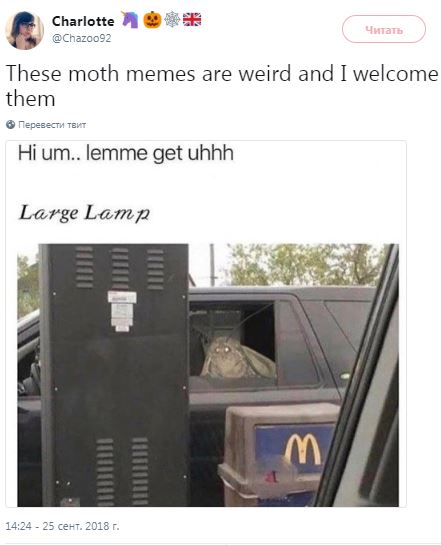 Пользователей интернета захватил новый мем о мотыльке. Началось все с того, что пользователь Twitter с ником @apricotbelly опубликовал в конце июля фото насекомого с подписью "мотыльки они такие - у вас есть какие-нибудь лампы".