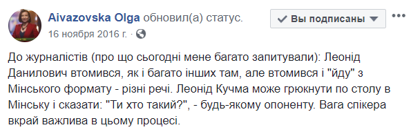 "Леонид Кучма может хлопнуть по столу в Минске и сказать: "Ты кто такой?", - любому оппоненту. Вес спикера крайне важен в этом процессе", - писала в Facebook Айвазовская, комментируя первые намерения второго президента выйти из ТКГ.