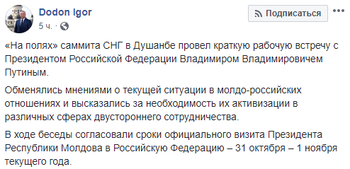 Додон согласовал с Путиным сроки своего официального визита в Россию (31 октября - 1 ноября). Они также "высказались за необходимость активизации молдавско-российских отношений в различных сферах двустороннего сотрудничества".
