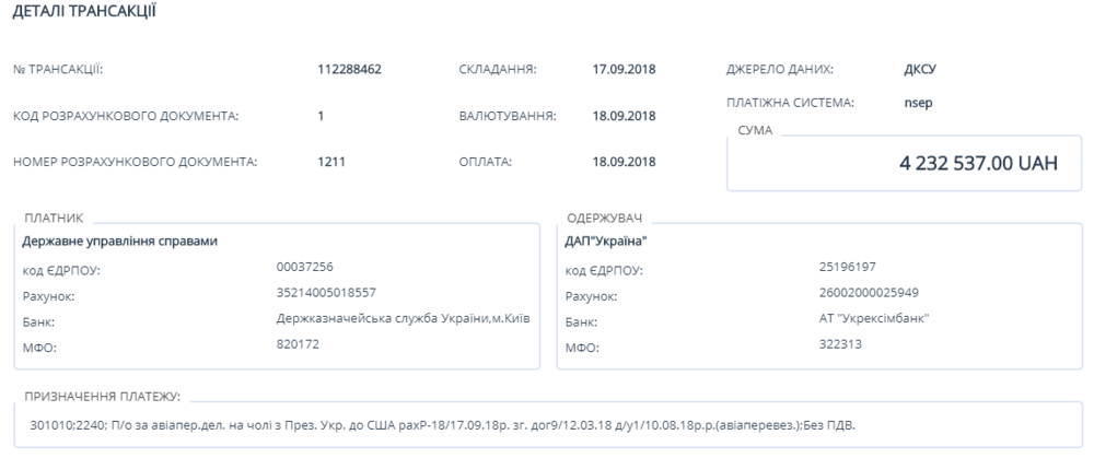 С учетом НДС, стоимость перевозки составляет 5,08 миллионов гривен. Перевозкой президента занималось государственное авиационное предприятие "Украина", плательщиком за услуги выступило Государственное управление делами.