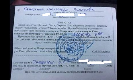 "Вам надлежит явиться в Печерский военный комиссариат, - говорится в сообщении, подписанном военным комиссаром С.М Макаренко, - Предлагаю Вам прибыть СРОЧНО по адресу ул. Болбочана, дом 1, комната 22".