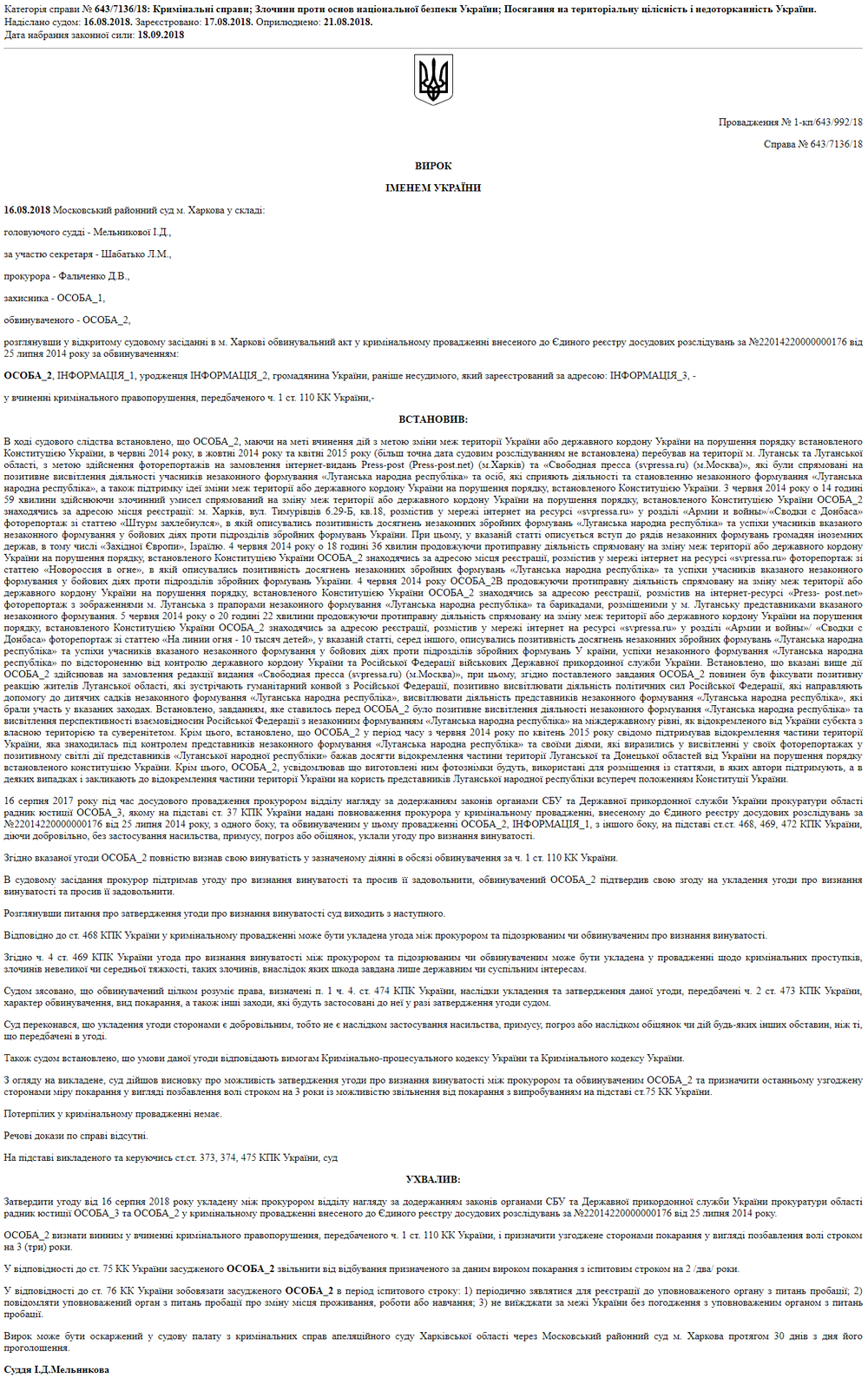 Решением Московского районного суда Харькова фотокорреспондент, который в 2014-2015 годах ездил в Луганск, а потом размещал сделанные там фотографии на различных ресурсах, получил 3 года условно. Об этом речь идет в судебном решении, размещенном в Едином реестре.