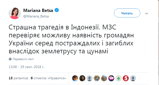 Вчера, 28 сентября, в Индонезии произошло сильнейшее землетрясение, которое вызвало появление цунами. Более 400 человек погибли в результате стихийного бедствия. Были ли среди них украинцы, проверяет Министерство иностранных дел. Об этом на своей странице в Twitter сообщила экс-пресс-секретарь МИД Марьяна Беца.