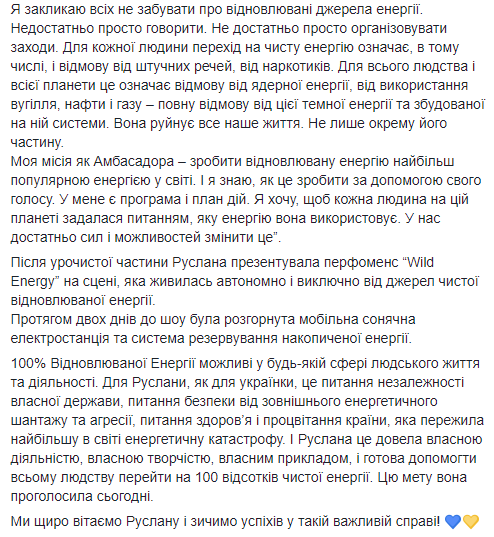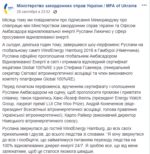 "Завершился шоу-перфоманс Русланы на глобальном саммите WindEnergy Hamburg 2018 в Германии. Руслана официально провозглашена глобальным амбассадором возобновляемой энергии в мире и получила соответствующий сертификат инициативы Global 100% RE из рук Стефана Гсаенера (генеральный секретарь Всемирной ветроэнергетической ассоциации и член исполнительного комитета платформы Global 100% RE)", - говорится в сообщении.