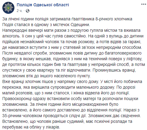 Ребенка в полицию отвела женщина, которая увидела, как мальчик утром идет ко своему дому. Полиция сразу же начала поиски насильника и нашла его через несколько часов.