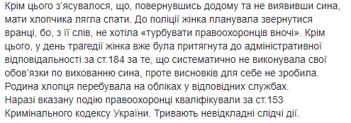 "Кроме этого выяснилось, что, вернувшись домой и не обнаружив сына, мать мальчика легла спать. В полицию женщина планировала обратиться утром, потому что, по ее словам, не хотела "беспокоить правоохранителей ночью". Кроме этого, в день трагедии женщина уже была привлечена к административной ответственности по ст.184 за то, что систематически не выполняла свои обязанности по воспитанию сына, однако выводов для себя не сделала. Семья ребенка находилась на учете в соответствующих службах", - отметили в полиции.