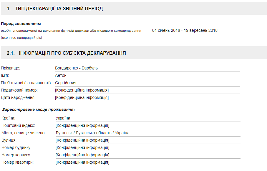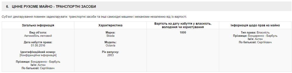 Отметим, что информация об автомобиле, который фигурирует в этой истории, также содержится в декларации перед увольнением Антона Бондаренко-Барбуля.
