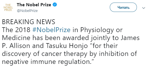 Сегодня, 1 октября, в Стокгольме объявили имена обладателей Нобелевской премии по медицине и физиологии. Премия присуждена Джеймсу Эллисону и Тасуку Хондзё за исследования в области терапии рака. Об этом сообщается в Twitter.