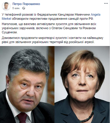 Президент Украины отметил важность активизации усилий для освобождения всех украинских заложников, включая с Олегом Сенцовым и Романом Сущенко. Также речь шла  о перспективах продолжения санкций против РФ.