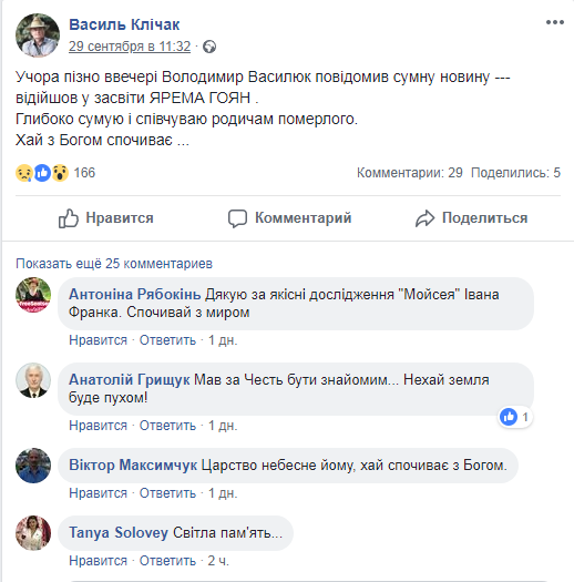 28 сентября в Украине умер известный публицист, журналист, руководитель детского издательства Ярема Гоян. Об этом на своей странице в Facebook сообщил директор издательского центра "Просвита" Василий Кличак.