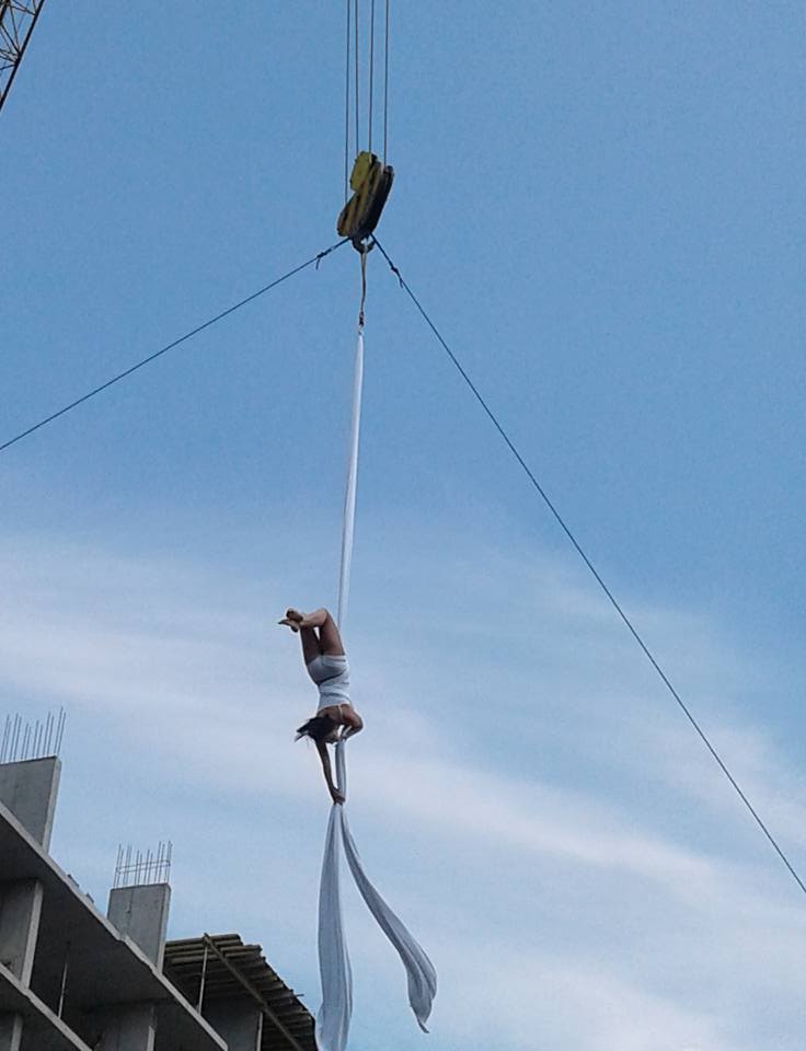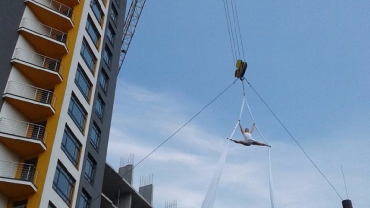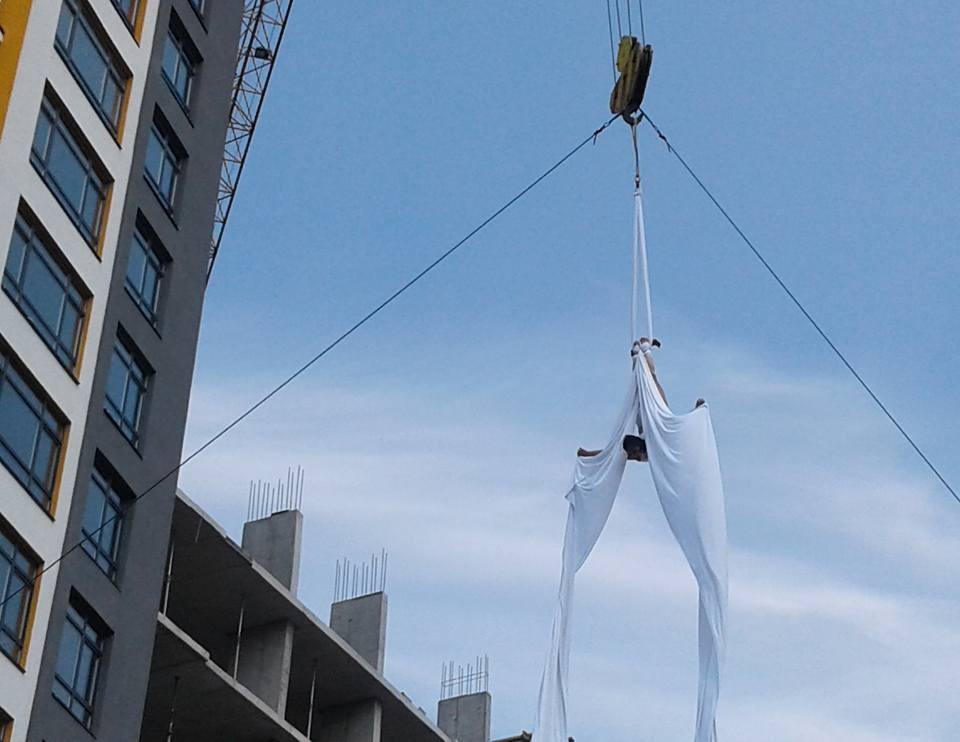 Впервые в Украине воздушная гимнастка Алла Попова исполнила арробатический номер на высоте 25 метров (высота 6 этажа) на тканевых полотнах, еще и без лонжевой страховки.