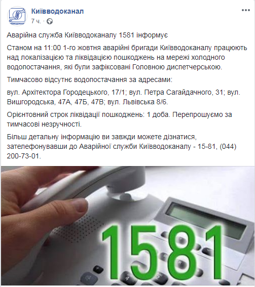 Отметим, что еще около 11:00 в "Киевводоканале" отчитались, что ориентировочно ликвидация повреждений займет сутки. Таким образом, жители указанных домов получат холодную воду 2 октября в первой половине дня.
