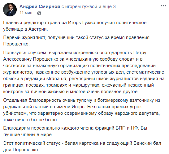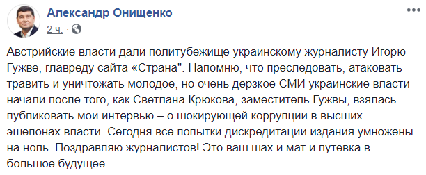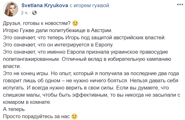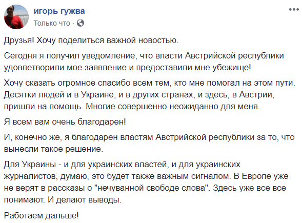 "Австрийские власти дали политубежище украинскому журналисту Игорю Гужве, главреду сайта "Страна". Напомню, что преследовать, атаковать травить и уничтожать молодое, но очень дерзкое СМИ украинские власти начали после того, как Светлана Крюкова, заместитель Гужвы, взялась публиковать мои интервью – о шокирующей коррупции в высших эшелонах власти. Сегодня все попытки дискредитации издания умножены на ноль. Поздравляю журналистов! Это ваш шах и мат и путевка в большое будущее".