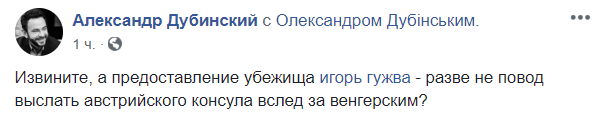 "Извините, а предоставление убежища Игорю Гужве - разве не повод выслать австрийского консула вслед за венгерским?", - интересуется журналист Александр Дубинский.