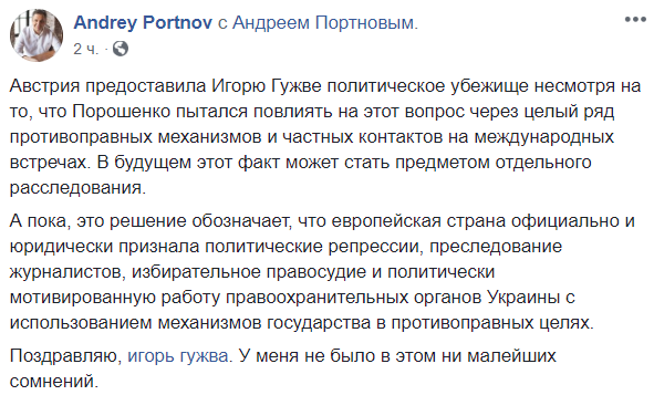 "Австрия предоставила Игорю Гужве политическое убежище несмотря на то, что Порошенко пытался повлиять на этот вопрос через целый ряд противоправных механизмов и частных контактов на международных встречах. В будущем этот факт может стать предметом отдельного расследования.