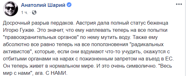 "Досрочный разрыв пердаков. Австрия дала полный статус беженца Игорю Гужве. Это значит, что ему наплевать теперь на все попытки "правоохранительных органов" по нему мутить воду. Также ему абсолютно все равно теперь на все поползновения "радикальных активистов", которые, если они вздумают что-то учудить, окажутся с отбитыми органами на нарах с пожизненным запретом на въезд в ЕС. Он теперь живет в нормальном мире. И это очень символично. "Весь мир с нами", ага. С НАМИ".