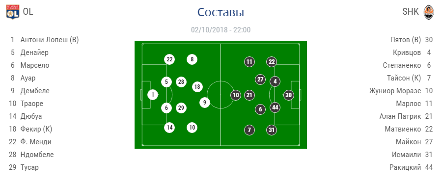 Лион: Лопеш - защита Дюбуа, Марсело, Денайер, Менди - опорные полузащитники Тусар, Ндомбеле - атака Траоре, Фекир, Ауар, Дембеле.