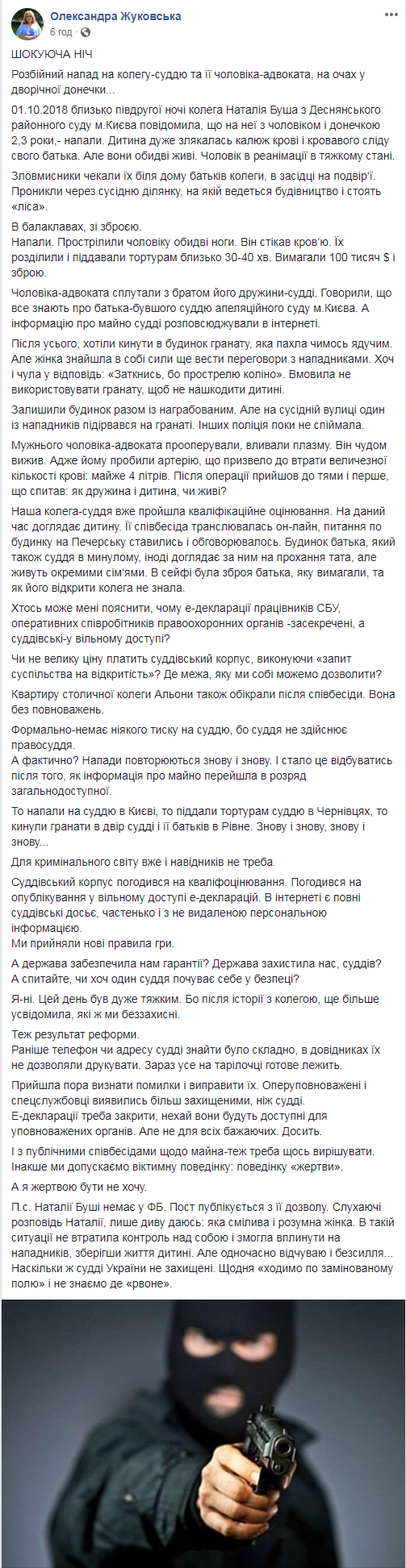 Немного оправившись от налета Наталья Буша поделилась пережитым со своей коллегой - судьей Дубновского суда Александрой Жуковской. Сама Жуковская и опубликовала соответствующий пост в Facebook.