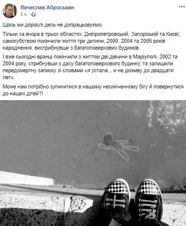 "И уже сегодня утром покончили с жизнью две девушки в Мариуполе, 2002 и 2004 года, прыгнув с крыши многоэтажного дома, и оставили предсмертную записку со словами «я устала ... и не доживу до двадцати лет", - написал в соцсети Аброськин.