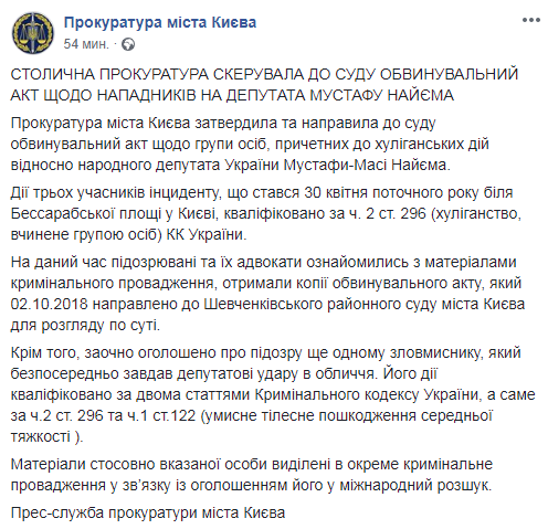 Киевская прокуратура отправила в суд обвинительный акт касаемо причастных к нападению на народного депутата Мустафу Найема. Об этом сообщила пресс-служба прокуратуры Киева на странице в Facebook.