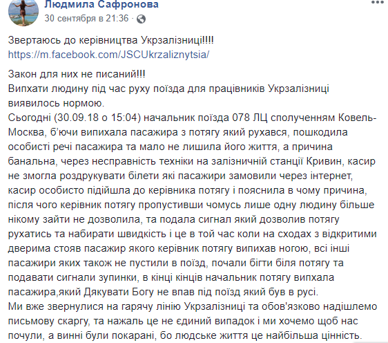В поезде из города Ковеля в Москву пассажиров вытолкали из вагона из-за отсутствия распечатанных билетов, когда состав уже начал движение. Об этом сообщила одна из пассажирок Людмила Сафронова в Facebook.