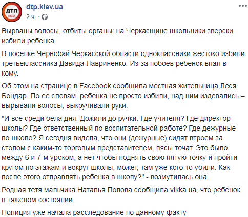 В поселке Чернобай Черкасской области третьеклассники жестоко избили своего одноклассника Давида Лавриненко. После побоев ребенок впал в кому.
