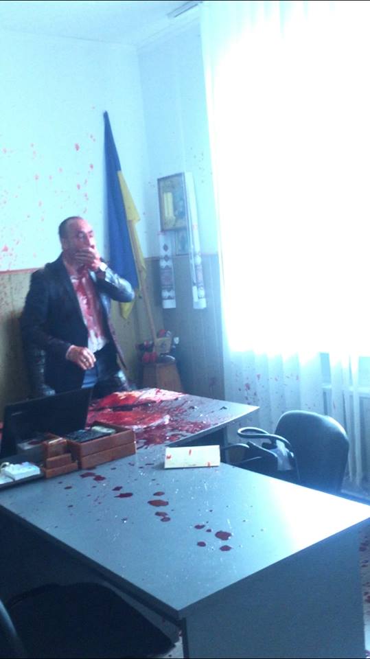 Мэра города Гнивань Винницкой области Владимира Кулешова активисты облили кровью в рабочем кабинете, передает "Вінниця.info".