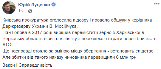 Луценко добавил, что чиновник нанес ущерб государству на более 6 миллионов гривен. "Господин председатель в 2017 году решил переместить зерно из Харьковской в Черкасскую область якобы в связи с опасностью потери из-за близости АТО! Что на самом деле стояло за изменением места хранения - установит следствие. Но убытки от такого приказа чиновника превысили 6 миллионов гривен", - написал Луценко.