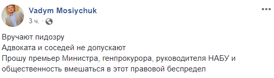 Сам Мосийчук сообщил в Facebook, что правоохранители во время вручения ему подозрения не пускали адвоката.
