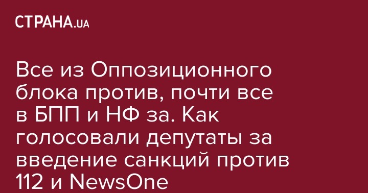 Верховная Рада на заседании 4 октября проголосовала за внесение на рассмотрение СНБО предложение санкций против каналов NewsOne и 112-Украина. Внесение этого вопроса в повестку было вызвано тем, что петиция "Прекратить антиукраинскую деятельность телеканала "112 Украина" и NewsOne" на сайте Верховной Рады досрочно набрала более 25 тысяч голосов.