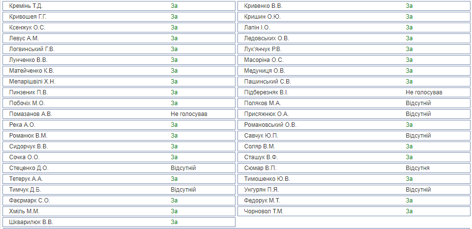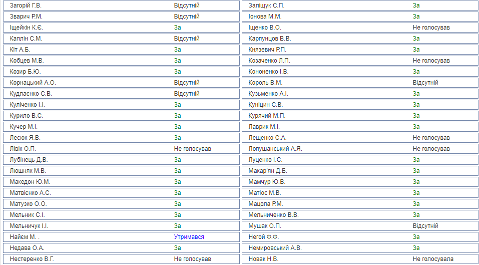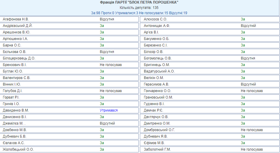 Так, на заседании присутствовало 116 депутатов от фракции "БПП" из 135, из них 98 человек проголосовало за, 15 не голосовало вовсе, трое воздержалось. К слову, среди воздержавшихся - журналист, один из создателей "Громадського телебачення" Мустафа Найем.
