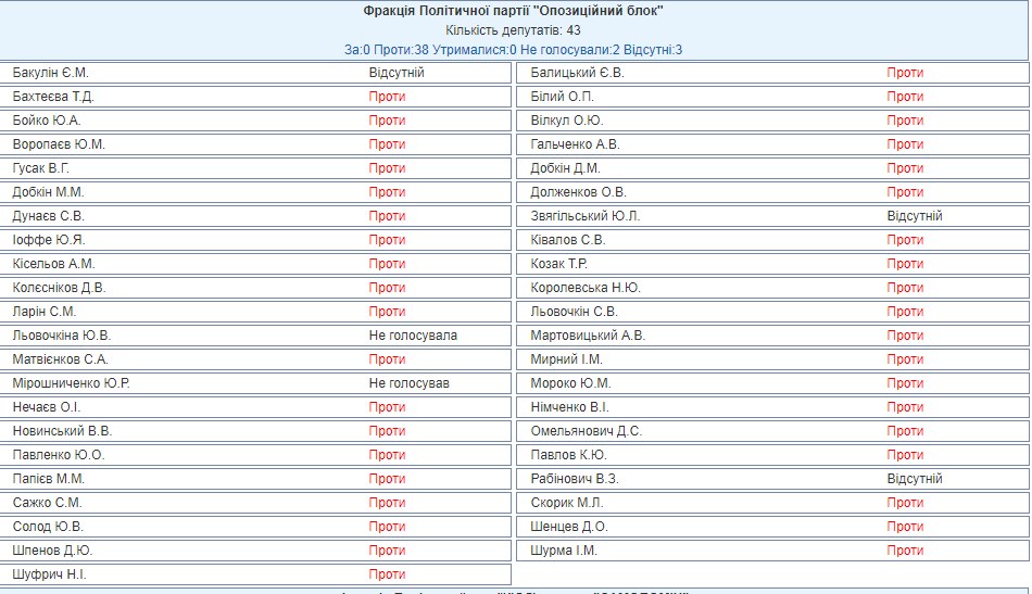 Что касается "Оппоблока", на сегодняшнем заседании было 40 представителей фракции из 43. Двое из них не голосовали, остальные 38 человек единодушно выступили против введения санкций.