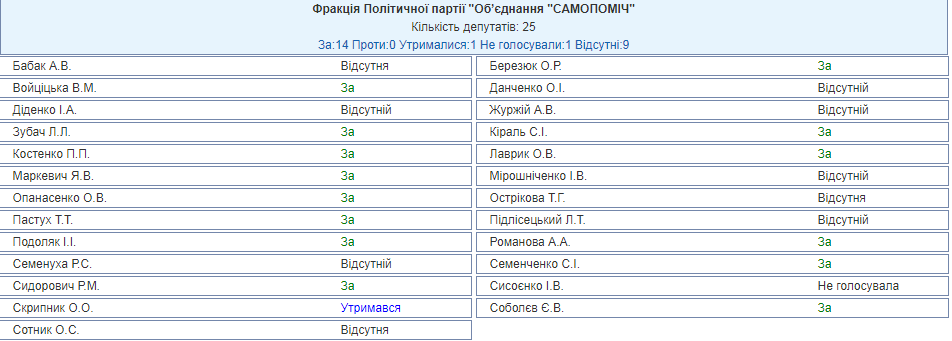 Из 25 парламентариев от "Самопомочи" сегодня на заседании было всего 16. Один из них не голосовал, один, нардеп Скрипник, воздержался, остальные 14 проголосовали "за".