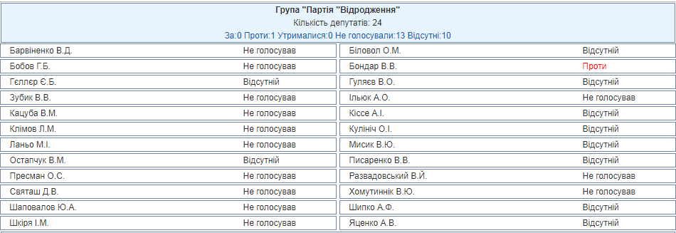 Голоса "Відродження" распределились следующим образом: "за" не проголосовал никто, "против" выступил нардеп Бондарь, 13 человек не голосовали, а еще 10 отсутствовали на сессии.