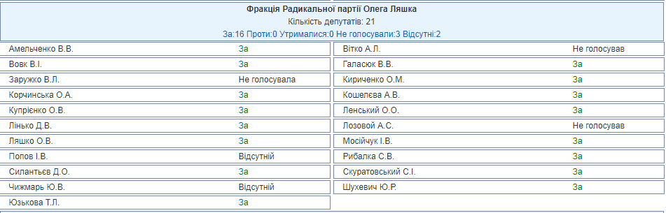Фракция "Радикальной партии Олега Ляшко" в целом поддержала введение санкций. "За" выступили 16 человек, трое не голосовали, двое не пришли.