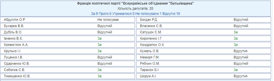 Из 20 представителей "Батьківщини" на голосовании присутствовали только 10, 9 из них выступили "за", один человек не проголосовал.