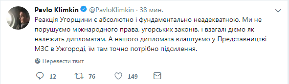 Глава Министерства иностранных дел Украины Павел Климкин уже знает, куда перевести украинского консула, которого выслали из Венгрии. Об этом он сообщил на своей странице в Twitter.