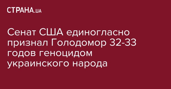 Сенат США единогласно принял двухпартийную резолюцию, которая стала первым в истории правовым актом Конгресса США, где Голодомор 1932-1933 гг признан геноцидом украинского народа. Об этом говорится в сообщении посольства Украины в США в соцсети.