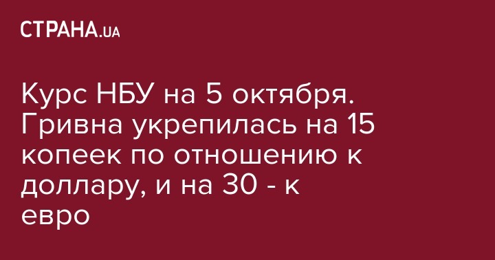 Курс НБУ на 5 октября. Гривна укрепилась на 15 копеек по отношению к доллару, и на 30 - к евро