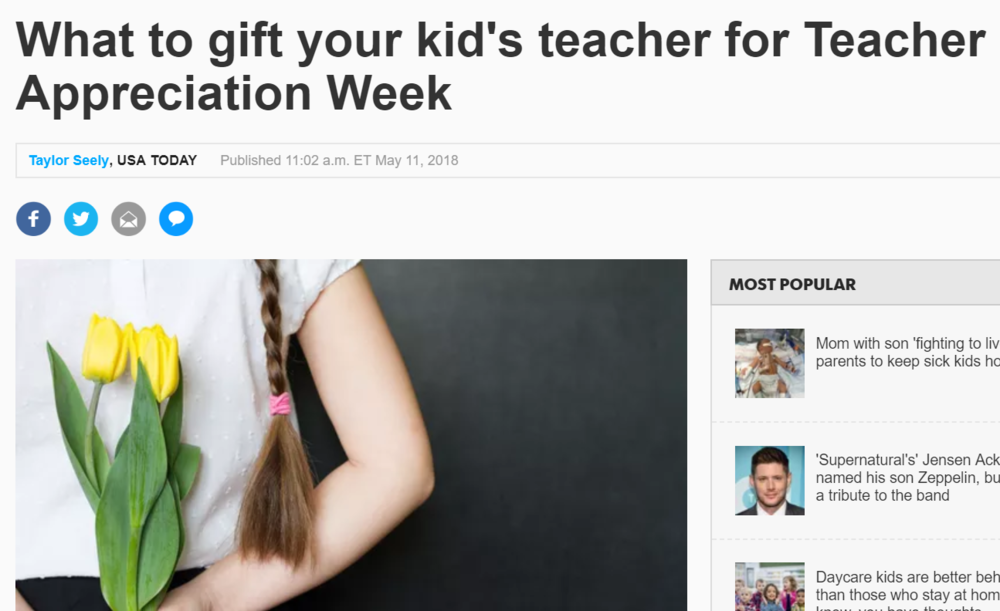 В это время американские СМИ наперебой рассказывают о том, какие подарки дарить учителям. Причем цветы, судя иллюстрации к майской статье в Usa Today - один из таких вариантов: