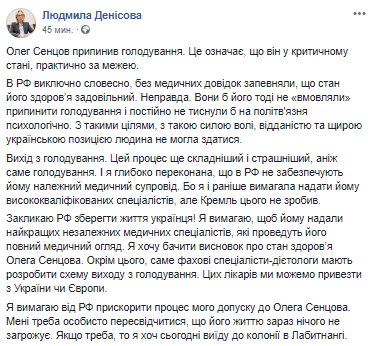 "Олег Сенцов прекратил голодовку. Это означает, что он в критическом состоянии, практически за чертой", - написала омбудсмен.