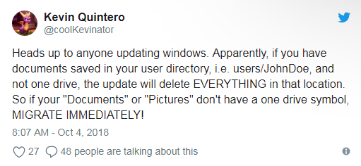 В "Твиттере" пользователи стали сами пытаться разобраться в причинах проблемы. Один из пользователей утверждает, что если файлы отсутствуют в облачном хранилище OneDrive, но есть на диске, то с обновлением Windows они будут потеряны. Новая версия перезаписывает файлы, если они хранятся в пользовательском каталоге (C:/Users/user/Documents/).