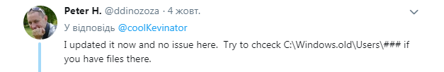 "Я только что обновил (Windows - Прим.Ред.) и проблемы нет. Попробуйте проверить C:\Windows.old\Users\### (директорию - Прим.Ред.), если у вас есть файлы там.