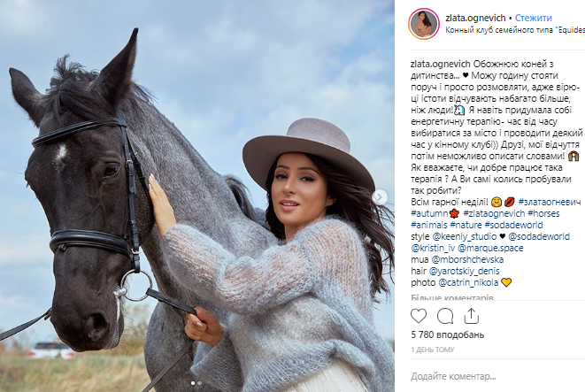 На странице исполнительницы в Instagram появилось фото, где она запечатлена рядом с серой лошадью. Для фотоистории Злата Огневич облачилась в легкий мохеровый свитер голубого цвета поверх белого платья. Образ наездницы был дополнен серой шляпой.