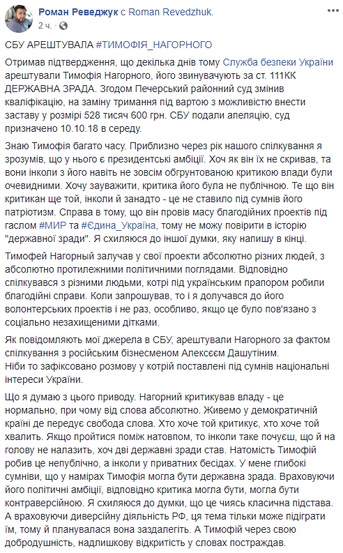 "Как сообщают мои источники в СБУ, арестовали Нагорного по факту общения с российским бизнесменом Алексеем Дашутиным. Якобы зафиксирован разговор в которой поставлены под сомнение национальные интересы Украины", - сообщил журналист.
