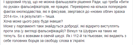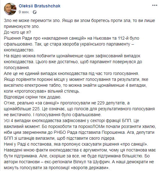 "Сейчас в Раде есть постановление, которое предлагает отменить решение "о санкциях". Приведенные мной факты кнопкодавства является аргументом, почему это постановление должно быть поддержано. Но, скорее всего, оно не будет поддержано большинством. Потому что авторы постановления – экс-регионалы Вилкул и Шуфрич. А наши демократы не могут голосовать за предложения "врагов государства", - комментирует Алексей Братущак.